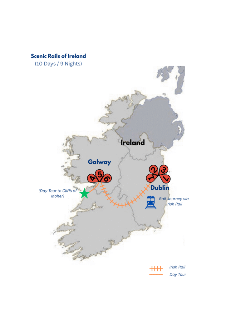 Embark on an eight-night train journey through Ireland, exploring Dublin’s Georgian elegance, Belfast’s Titanic Experience, and the rugged beauty of Galway and the Wild Atlantic Way. Enjoy walking tours in Dublin and Galway for deeper city connections.