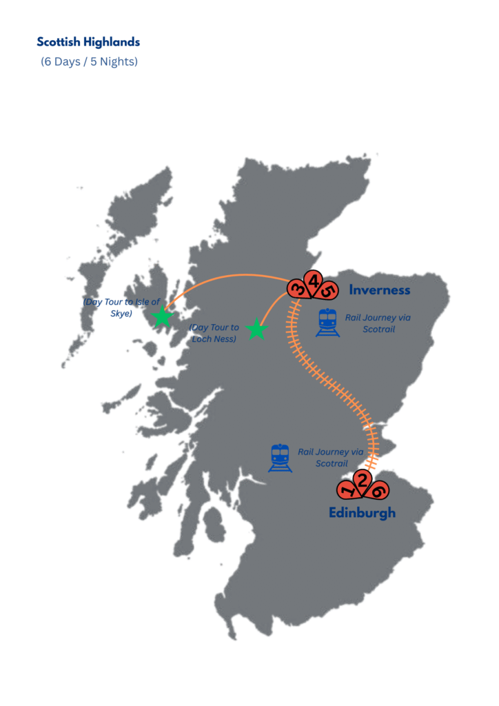 After breakfast, take the train from Edinburgh to Inverness, enjoying a scenic journey through the stunning landscapes of the Scottish Highlands. Upon arrival in Inverness, located on the country’s northeast coast, check in to your hotel for a three-night stay. Often referred to as the ‘gateway to the Highlands,’ Inverness is rich in culture and history, with a charming Old Town and landmarks like the 19th-century Inverness Cathedral.